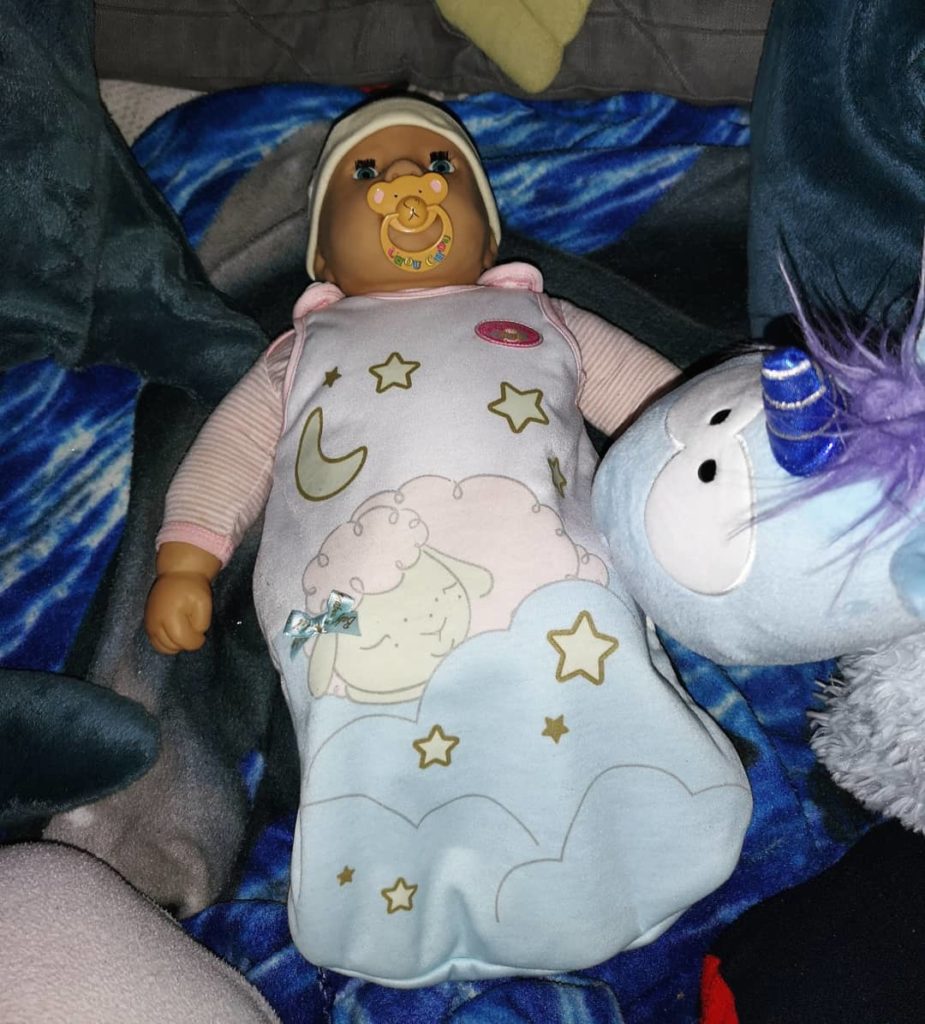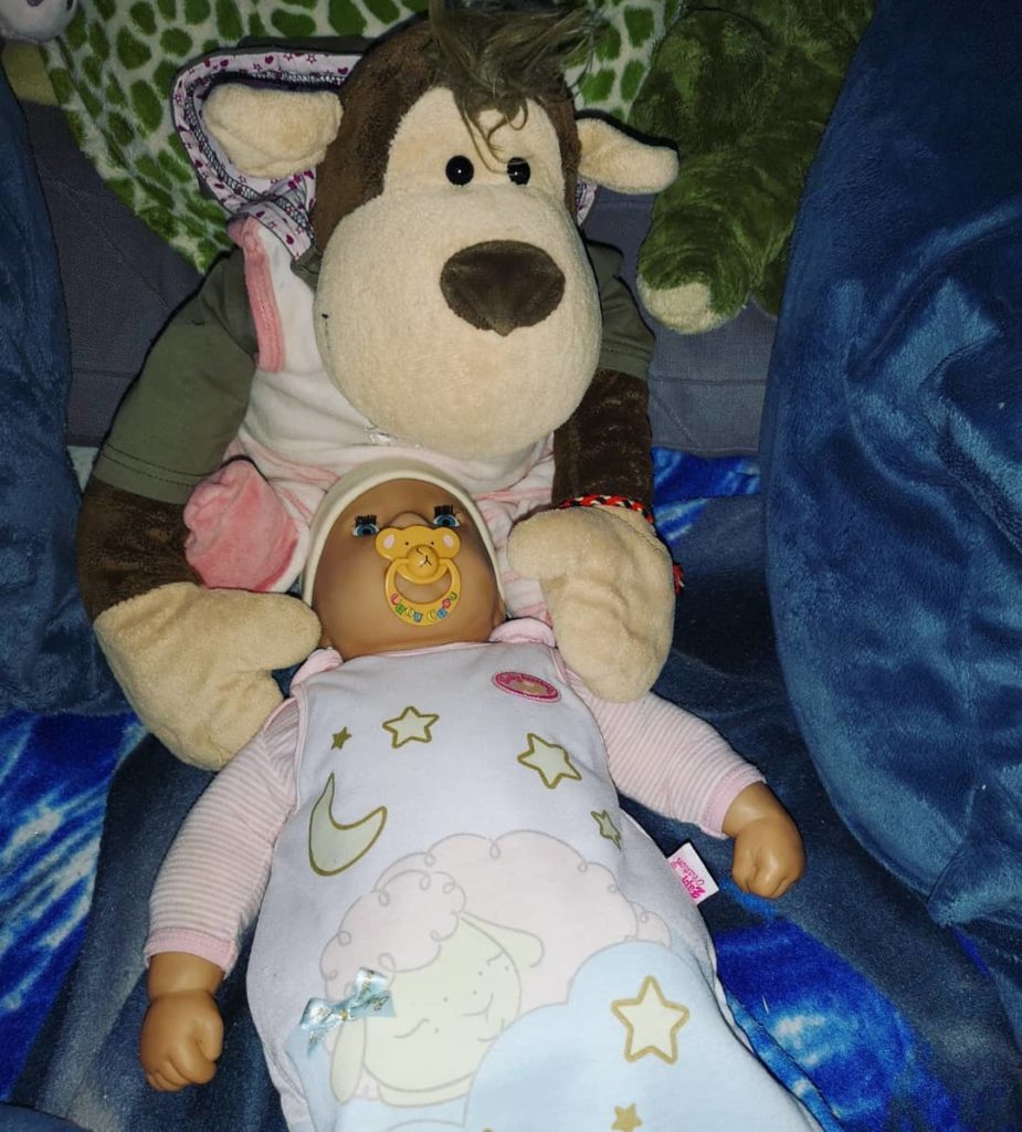 Yesterday in Nuremberg I bought my babygirl LauraMarie🚼 a new sleeping bag☁️🛏️☁️. Look how cute she is🍒. Lisa🐒 came right to take care of her. 🤗