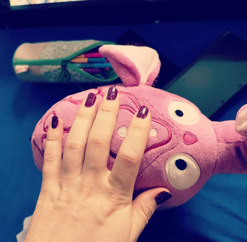 I have repainted🎨 my fingernails💅, this time in dark purple💜🖤 with pink glitter. I like glitter🌟💗, and my elephant too🐘😍