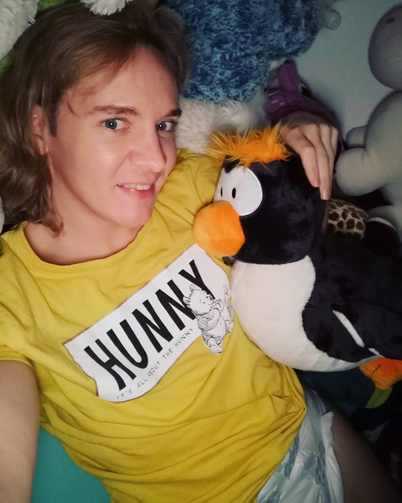 ❄️I built my pinguin Earl🐧 a velour snow❄️☄️ surface on my stomach so he feels more cozy by me side.🌨️❄️